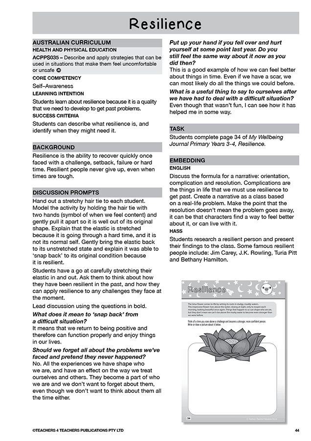 The teacher manuals provide background information on each topic presented in the journals, curriculum links, learning intentions, success criteria, core competency categorisation, whole-class discussion prompts, creative embedding activities across different facets of the curriculum, hands-on mindfulness activity ideas as well as general lesson notes and 29+ blackline master worksheets to aid in the teaching of Social, Emotional and Academic Learning (SEAL).